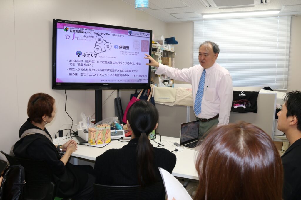 コスメティックサイエンス学環長の鯉川雅之理事による学環に関する説明の後、同学環の徳留嘉寛教授の研究室にて施設見学や研究に関する話が行われ、今後の共同研究の可能性も含めて、非常に有意義な視察となりました。